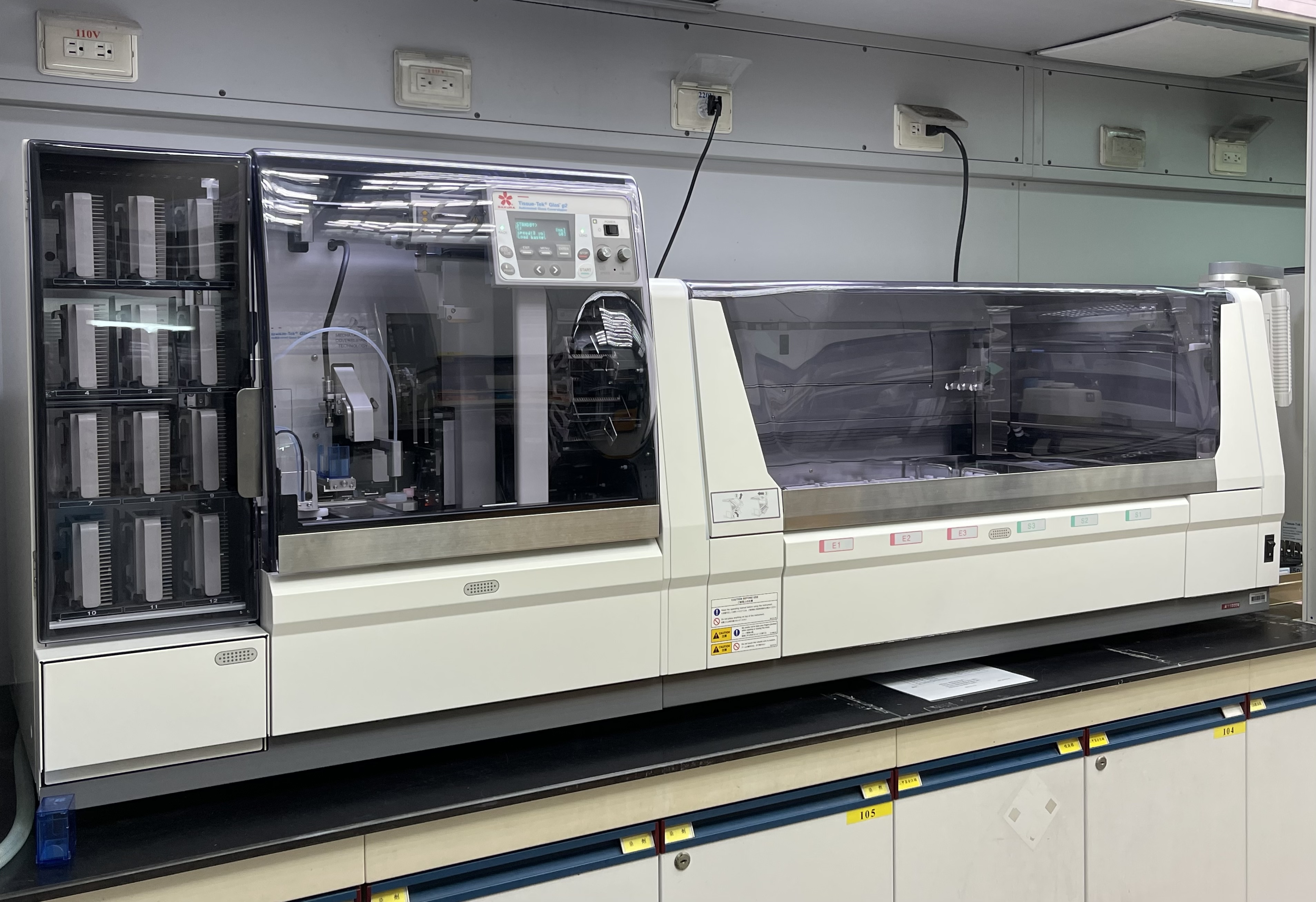 (二) 乳癌HER-2/neu 的基因擴增檢測 使用HER2 Dual ISH DNA Probe Cocktail 檢測。針對經過福馬林固定與石蠟包埋之人類乳癌和胃癌組織檢體,搭配全自動多功能組織病理染色系統,利用雙色原位雜交染色技術,可直接在光學顯微鏡下量化HER2 基因擴增的現象。此檢查主要為評估病患是否適合接受Herceptin(trastuzumab) 治療。